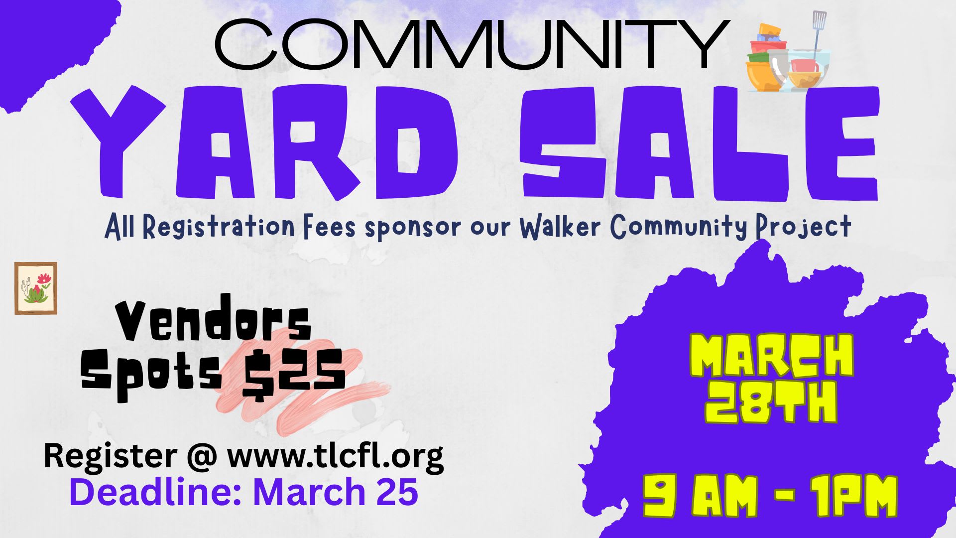 Looking for an easy way to make some extra cash? Then, reserve your spot now for TLC Community Church Yard Sale…. - Be a seller here with your own 12 x 10 parking space. ,br> • Do you have bikes, lawn tools or other valuable household items to sell?• Avoid the hassles of low-traffic residential garage sales!• Don't do it alone, instead join our crowd with more targeted buyers!• Food tent will keep your captive yard sale customers well fed!Vensors (sellers) must register and submit the $25 vendor’s fee by March 21st. The vendor’s fee covers the cost of the seller’s space only. Vendors must provide their own tables, displays, and materials.Payment is required to secure your space. To submit payment, please visit our website at www.tlcfl.org.Vendor’s Terms & Conditions:Rental Space Policy: All items sold on church grounds must be appropriate, family friendly, and non-harmful. No weapons, hazardous items, or explicit or offensive materials are permitted to be sold. The Light Center reserves the right to refuse sale of certain items. You are responsible for carrying your own items to your assigned space. All tables, items, and displays must fit within your assigned space. You must have your space clean and empty by 2PM. Inclement Weather Policy: If this event is rescheduled due to inclement weather, you'll be rescheduled for the new date. Refund Policy: No refunds if you cancel or don't show up the date of the yard sale.
